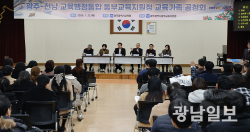 광주시교육청은 22일 동부교육지원청 대회의실에서 ‘광주·전남 교육행정통합 동부권 교육가족 공청회’를 열고 교육행정 체계 개편에 대한 현장 의견을 수렴했다.