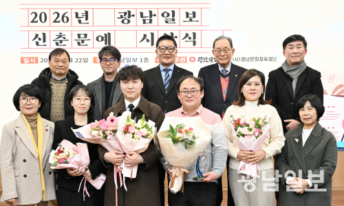 22일 오후 광주 북구 중흥동 광남일보 대강당에서 열린 ‘2026광남일보 신춘문예’시상식에 참석한 이승배 광남일보 사장, 임원식 한국예총 광주시연합회 회장, 김현주 광주전남작가회의 부회장, 박신영 국제펜 광주지역위원회 명예이사장등 내외빈들과 수상자 및 심사위원들이 기념촬영을 하고 있다. 사진 앞줄 왼쪽부터 시계반대 방향으로 배다인 동화 심사위원(아동문학가).윤소정 동화 당선자,최류빈 평론 당선자,민병훈 시 당선자,차현숙 소설 당선자,김현주 광주전남작가회의 부회장,정강철 소설 심사위원(소설가·광주 광덕고 교사), 임원식 광주예총 회장,이승배 광남일보 사장, 김영삼 평론 심사위원, 곽재구 시 심사위원(시인·전 순천대 문예창작과 교수).최기남 기자 bluesky@gwangnam.co.kr