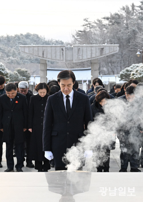 묵념하는 조국 대표 조국 조국혁신당 대표가 23일 오전 광주 북구 운정동 국립518민주묘역을 찾아 참배하고 있다. 최기남 기자 bluesky@gwangnam.co.kr