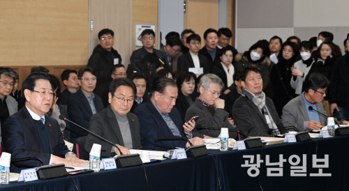 광주·전남 행정통합 특별법 검토 제3차 간담회 25일 오후 광주 서구 치평동 김대중컨벤션센터에서 열린 광주·전남 행정통합 특별법 검토 제3차 간담회에 참석한 강기정 광주시장과 김영록 전남도지사가 지역 국회의원들과 특별법 내용에 대해 논의하고 있다.최기남 기자 bluesky@gwangnam.co.k