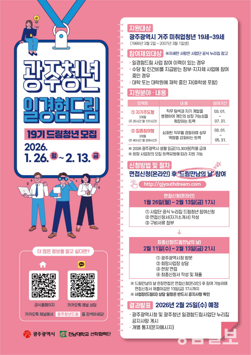 광주시는 상반기 ‘광주청년 일경험드림’에 참여할 제19기 드림청년 450명을 선발한다고 26일 밝혔다.