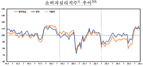 26일 한국은행 광주전남본부가 발표한 ‘2026년 1월 광주·전남지역 소비자동향조사’ 결과에 따르면 소비자심리지수(CCSI)는 112.0으로 지난달보다 0.7p 하락했다.