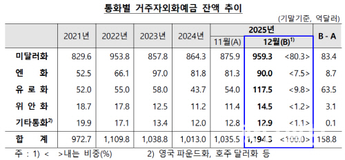 한국은행이 26일 발표한 ‘거주자 외화예금 동향’에 따르면 지난해 12월 말 기준 외국환은행의 거주자 외화예금 잔액은 1194억3000만달러로 전월 말보다 158억8000만달러 늘었다.