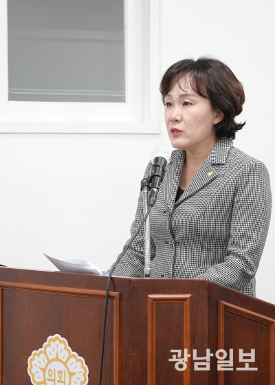 노소영 광주 남구의원이 26일 기획초무위원회 심사에서 ‘남구 구정 소통 문자서비스 운영’ 조례안을 설명하고 있다.