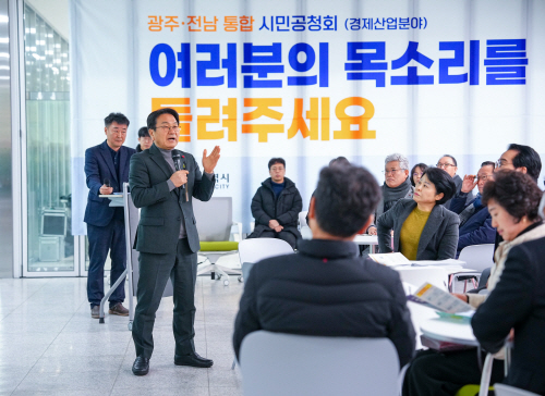 광주시는 26일 광주창업거점인 북구 스테이지(빛고을창업스테이션)에서 ‘광주전남 행정통합 경제·산업 분야 직능별 시민공청회’를 열고 경제단체, 산업계, 농업인 등 각계 의견을 폭넓게 청취했다.