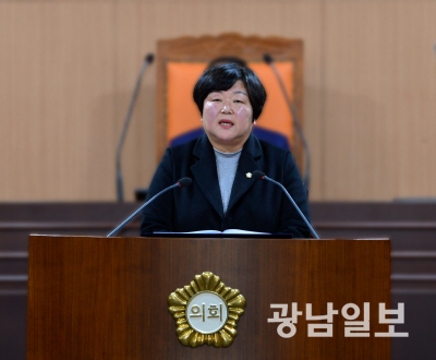 손혜진 광주 북구의원이 26일 제308회 임시회 제1차 본회의 5분 자유발언을 통해 북구청과 산하기관 기간제 노동자들의 처우 개선과 정규직 전환을 촉구하고 있다.