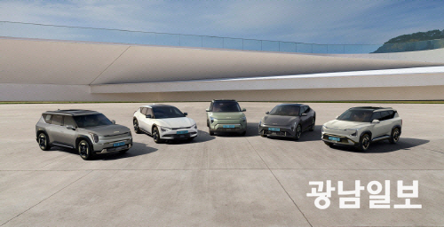 기아 EV 라인업. 왼쪽부터 EV9, EV6, EV3, EV4, EV5.