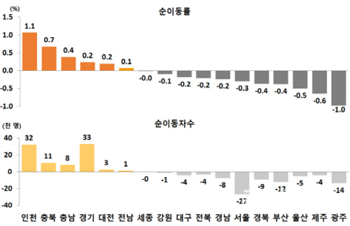 권역별로는 순유입이 가장 많은 곳은 3만8000명이 유입된 수도권이었고, 영남권은 3만9000명이 빠져나가 순유출이 가장 많았다.