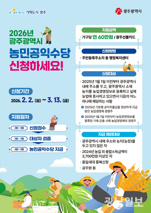 광주시는 2026년도 농민공익수당 신청·접수를 2일부터 다음달 13일까지 주소지 관할 동 행정복지센터에서 진행한다.