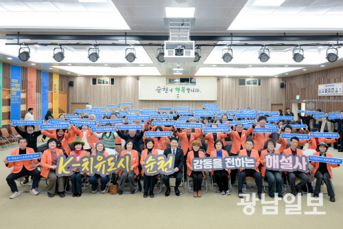 최근 ‘2026년 순천시 해설사 위촉식’에서 해설사들이 K-치유도시 순천 실현을 다짐하며 기념촬영을 하고 있다.