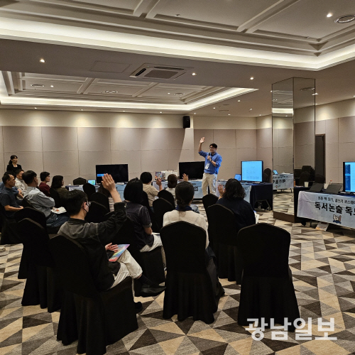 김경룡 대표가 지난해 진행된 강진군 교육지원청 연수에서 교사들을 대상으로 강연을 하고 있다.