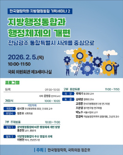 특히 전남광주통합특별시 논의를 구체적 사례로 △광역행정통합에 따른 행정체제 개편 방향 △기초자치단체의 기능과 형태 재설계 문제 △자치구 체제의 한계와 대안적 행정모델 등을 중심으로 심층적인 정책·학술 토론이 진행될 예정이다.