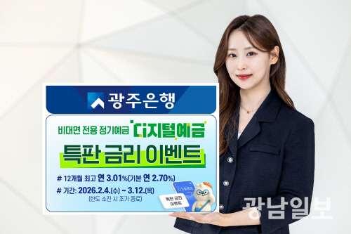 광주은행(은행장 정일선)은 최고 연 3.01%의 금리를 제공하는 비대면 전용 정기예금 상품인 디지털예금 특판 금리이벤트를 실시한다고 4일 밝혔다.
