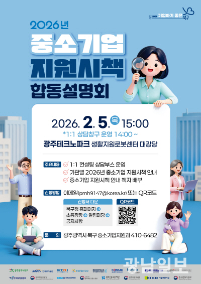 광주 북구가 5일 오후 3시 광주테크노파크 생활지원로봇센터 대강당에서 ‘2026년 중소기업 지원시책 합동설명회’를 개최한다.