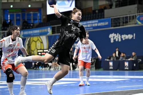 지난 1일 광주빛고을체육관에서 열린 서울시청과의 신한 SOL Bank 2025-2026 핸드볼 H리그 여자부 1라운드 6차전에서 광주도시공사 연지현이 점프슛을 하고 있다. 사진제공=한국핸드볼연맹(KOHA)