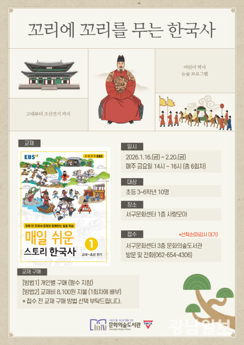 문화의숲도서관 관계자는 “역사는 단순한 과거의 기록이 아니라 논리적 사고를 위한 가장 좋은 교과서”라며, “이번 프로그램을 통해 아이들이 역사 인식을 넓히는 것은 물론, 자신의 생각을 조리있게 전달하는 ‘논술의 달인’으로 거듭나길 바란다”고 전했다. 문의 062-654-4306.