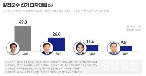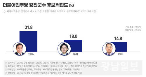 한편 이번 여론조사는 광남일보·KBC 광주방송 의뢰로 여론조사전문기관 리서치뷰가 지난 2~3일 이틀간 만 18세 이상 강진군민 500명(통신사 제공 가상번호 100%)을 대상으로 ARS 자동응답시스템으로 진행했다.