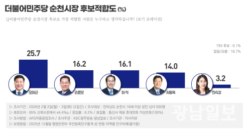 이와 함께 순천이 더불어민주당 강세 지역이라는 특성을 감안하면, 민주당 후보 적합도 조사 결과가 사실상 본선 판세를 가늠하는 지표로 해석될 수 있다.