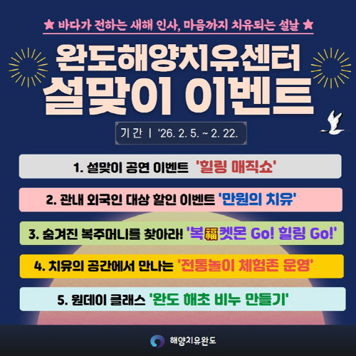 완도군은 설 명절을 맞아 오는 22일까지 귀성객과 군민, 관광객이 그동안 쌓인 피로를 풀고 활력을 얻을 수 있도록 ‘완도해양치유센터, 설맞이 힐링 이벤트’를 운영한다.