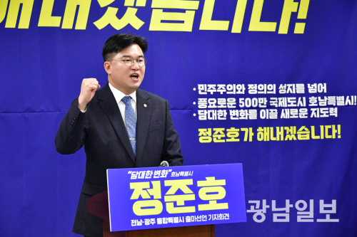 정준호 의원은 “젊기 때문에 무모할 정도로 담대한 변화를 선택할 수 있다”며 “떠나는 호남이 아닌 다시 사람들이 모여드는 특별시를 만들겠다”며 “10년 안에 인구 500만 시대를 반드시 열겠다”고 말했다.