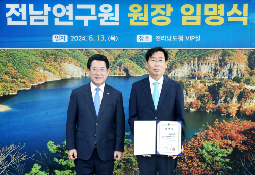 김영선 전남연구원장이 김영록 전남도지사로부터 전남연구원장 임명장을 수여받았다.