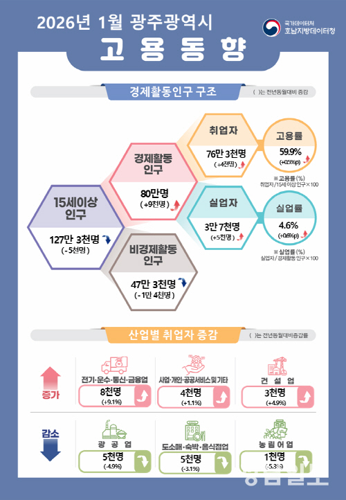 11일 국가데이터처 호남지방데이터청이 발표한 ‘1월 광주·전남 고용동향’에 따르면 광주의 고용률은 59.9%로 전년 동월 대비 0.5%p 상승했다. 취업자는 76만3000명으로 4000명 증가했다.