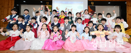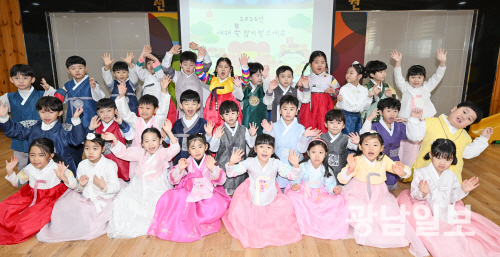 12일 오전 광주 광산구 선암동 선운숲유치원에서 열린 ‘설맞이 전통문화 체험’에서 한복을 곱게 차려 입은 어린이들이 새해 인사를 하고 있다. 어린이들은 새해 소망을 나누는 활동과 함께 윷놀이, 투호던지기 등 다양한 전통 놀이 체험 등으로 우리나라 고유 명절인 설날의 의미를 되새기고 전통 예절과 문화를 직접 체험했다.최기남 기자 bluesky@gwangnam.co.kr