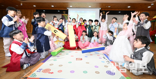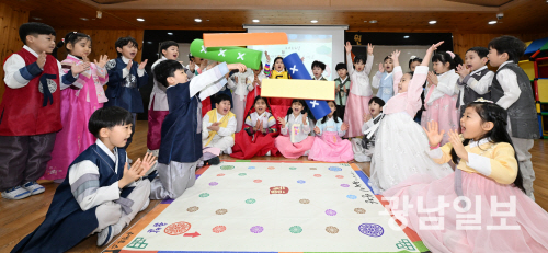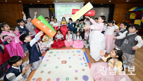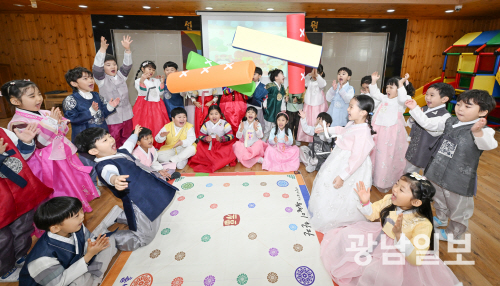 민족 최대 명절인 설을 앞두고 12일 오전 광주 광산구 선암동 선운숲유치원에서 열린 ‘설맞이 전통문화 체험’에서 한복을 곱게 차려 입은 어린이들이 전통 민속놀이인 윷놀이를 하며 즐거운 시간을 보내고 있다.‘설’, ‘설날’은 음력 정월 첫날을 이르는 말로 추석과 함께 한국의 대표적인 전통 명절이다. 가족들이 모여 조상에게 차례를 지내고, 어른들에게 세배를 올리며, 서로 덕담을 주고받는 풍습이 있다. 이날을 전후하여 윷놀이·널뛰기·연날리기 같은 세시 민속놀이를 행하기도 한다. 최기남 기자 bluesky@gwangnam.co.kr