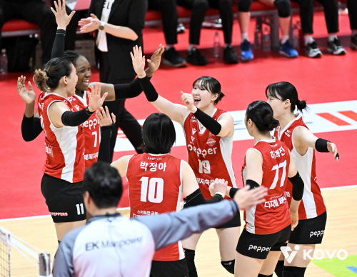 여자프로배구단 페퍼저축은행 AI페퍼스가 정관장을 꺾고 창단 이후 첫 최하위 탈출에 성공했다.
