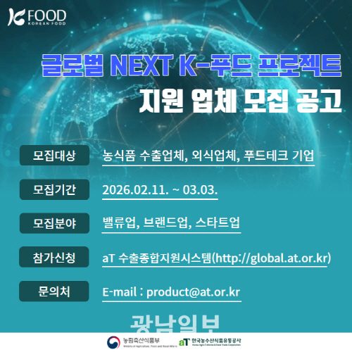 한국농수산식품유통공사는 ‘2026 글로벌 NEXT K-푸드 프로젝트’ 사업 참여 기업을 다음달 3일까지 모집한다.