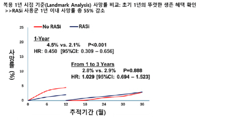 반면, 시술 후 첫 1년을 주요 심혈관 사건 없이 보낸 환자들의 12개월부터 36개월 사이의 레닌-안지오텐신계 저해제 지속 복용과 생존율에는 유의미한 상관 관계가 발견되지 않았다.
