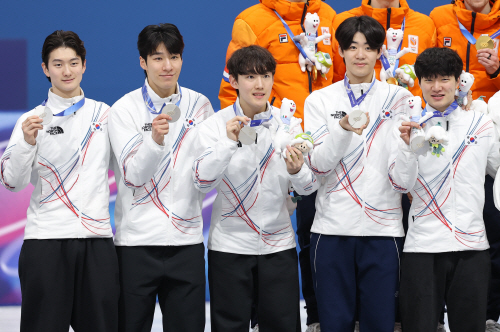 20일(현지시간) 이탈리아 밀라노 아이스스케이팅 아레나에서 열린 2026 밀라노ㆍ코르티나담페초 동계올림픽 쇼트트랙 남자 5,000m 계주 결승에서 은메달을 차지한 한국대표팀 선수들이 시상대에 올라 메달을 들어보이고 있다. 연합뉴스