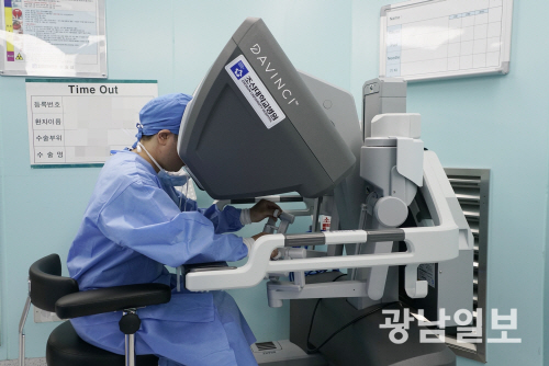 신민호 조선대병원 외과 교수가 로봇 수술을 진행하고 있는 모습.