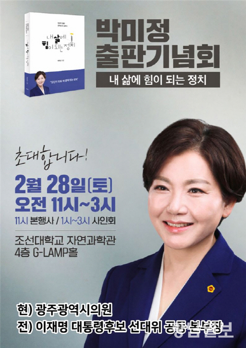 박미정 광주시의회 의원(더불어민주당·동구2)이 오는 2월 28일 조선대학교 자연과학관에서 저서 ‘내 삶에 힘이 되는 정치’의 출판기념회를 개최한다.