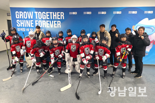 24일 강릉아이스하키센터에서 ‘제107회 전국동계체전’ 광주 아이스하키 초등부 대표팀이 기념 촬영을 하고 있다. 사진제공=광주시체육회
