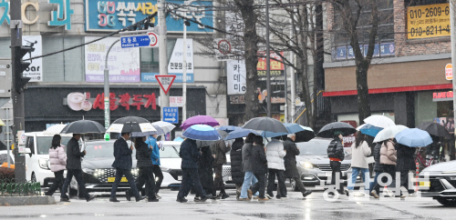 비 내리는 거리 광주·전남 지역에 봄을 재촉하는 비가 내린 24일 오후 광주 북구 용봉동 한 횡단보도애서 우산을 쓴 시민들이 걸어가고 있다. 최기남 기자 bluesky@gwangnam.co.kr