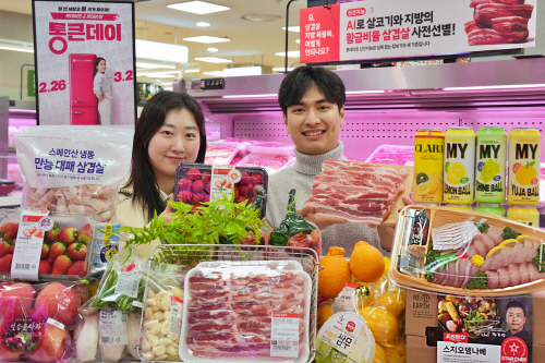 26~27일 ‘수입산 끝돼 삼겹살(100g)’을 행사카드 결제 시 990원에, 28일부터 3월 3일까지 ‘국내산 삼겹살(100g)’을 행사카드 결제 시 1390원에 판매한다.