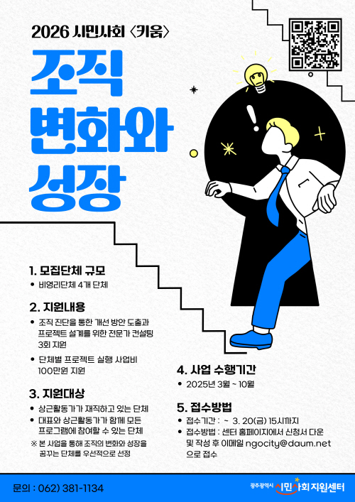 센터 관계자는 “지역 비영리단체들이 겪는 재정 불안정, 미션 재정립, 인력 부족 등의 구조적 문제를 함께 진단하고, 실질적 개선과 실행까지 이어지는 과정을 지원하고자 한다”며 “조직의 전환점을 만들고 싶은 단체들의 적극적인 참여를 기대한다”고 밝혔다.