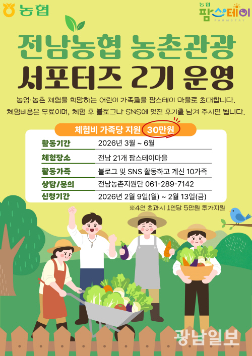 농협전남본부는 전남팜스테이마을협의회와 함께 농업·농촌체험을 희망하는 어린이 10가족을 선정해 본격적인 농촌관광 서포터즈 활동을 다음달 1일부터 시작한다고 26일 밝혔다.