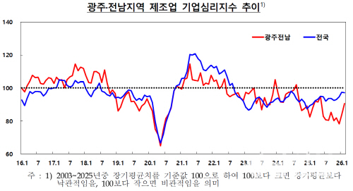26일 한국은행 광주전남본부의 ‘2026년 2월 광주·전남지역 기업경기조사 결과’에 따르면 제조업 기업심리지수(CBSI)는 90.5로 전월보다 6.8p 상승했다.
