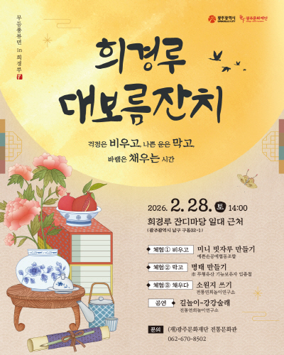 광주문화재단은 병오년 정월대보름(3.3)을 맞아 28일 전통문화관과 희경루 두 곳에서 대보름 특별행사를 갖는다. 무형유산 보유단체의 길놀이 공연부터 기능보유자와 함께하는 체험, 민속놀이와 세시풍속 체험까지 두 공간의 색깔을 살려 대보름의 의미를 되짚는다.
