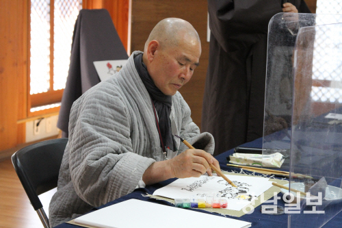 탱화장 송광무씨가 세화를 그리고 있다.