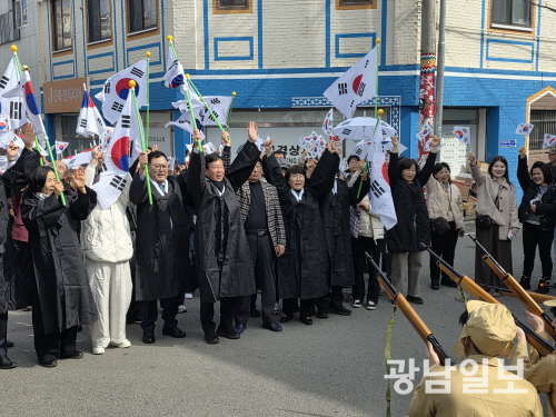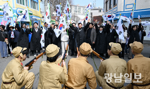 행진 도중 일본 헌병 복장을 한 이들이 모형 소총을 들고 만세 시위를 저지하는 장면도 재연됐다. 긴장감이 감도는 순간, 참여자들은 오히려 더 큰 목소리로 “대한독립 만세”를 외치며 위협에 맞섰다.
