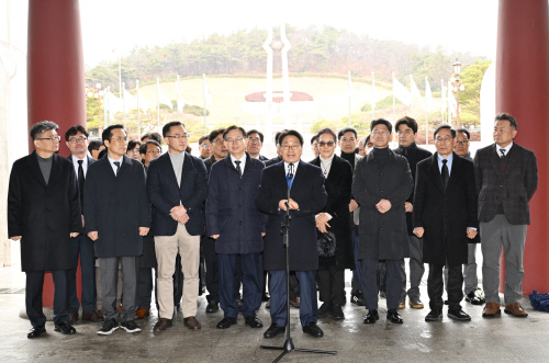 강기정 광주시장이 2일 오후 광주 북구 운정동 국립5·18민주묘지 민주의 문에서 간부 공무원 및 산하공공기관장과 함께 전남광주 통합특별법 국회 의결에 대한 입장문을 발표하고 있다. 최기남 기자 bluesky@gwangnam.co.kr