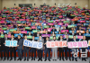 3일 오후 나주 한국에너지공과대학교 대강당에서 열린 ‘전남광주 행정통합 특별법 제정 시도민 보고대회’에 참석한 강기정 광주시장과 김영록 전남도지사.김원이 국회의원, 신수정 광주시의회 의장, 김태균 전남도의회 의장, 범시도민협의회 위원및 시도민대표들이 퍼포먼스를 펼치고 있다. 최기남 기자 bluesky@gwangnam.co.kr