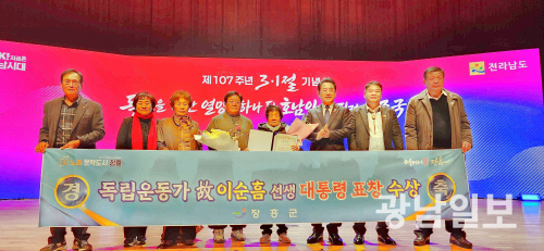 지난 1일 전남도 김대중강당에서 열린 제107주년 3·1절 기념식에서는 장흥 출신 고 이순흠 선생이 독립유공자 대통령 표창을 수상했다. 표창은 자녀 이영애 씨가 대리 수훈했다.