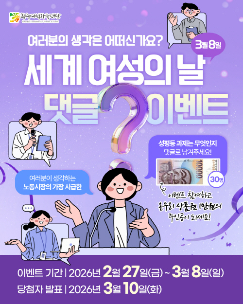 재단은 국내 노동시장의 성별임금격차 등 주요 현안을 시민들이 쉽게 이해하고 공감할 수 있도록 카드뉴스 형태로 구성, 인스타그램에 게재했다. 관심 있는 시민들은 재단 인스타그램 계정을 팔로우한 뒤 이벤트 게시물의 질문에 대한 의견을 댓글로 남기면 된다.