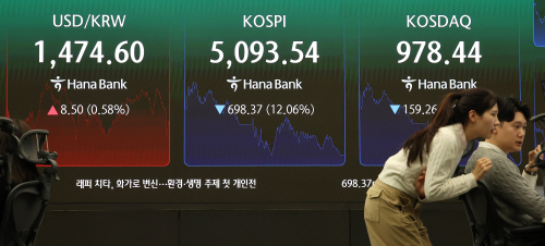 이날 코스피는 전장보다 698.37p(12.06%) 내린 5,093.54에, 코스닥은 159.26p(14.00%) 급락한 978.44에 장을 마쳤다. 원/달러 환율은 10.1원 오른 1476.2원이다. 연합뉴스
