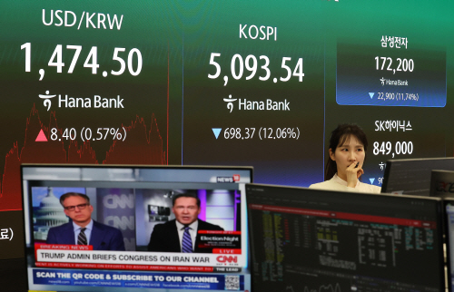 코스피가 미국과 이란 간 전쟁 발발 여파로 역대 최대 폭으로 폭락해 5100선마저 내준 4일 서울 중구 하나은행 본점 딜링룸에 코스피가 표시돼 있다.