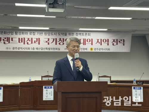 민형배 더불어민주당 국회의원이 지난 3일 광주시의회에서 열린 ‘남도문화산업 그랜드비전과 국가창업시대의 지역 전략’ 정책토론회에서 전남광주특별시를 대한민국 대표 문화수도로 도약시키기 위한 6대 핵심 비전을 발표하고 있다.